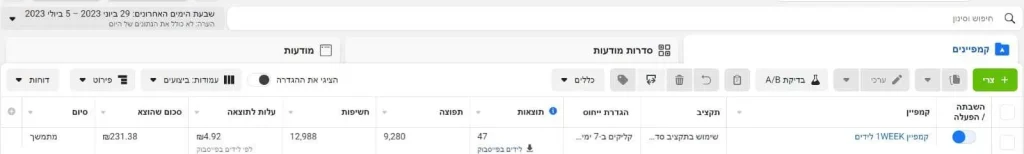 - הקמה וניהול קמפיין ממומן בפייסבוק ובאינסטגרם (קמפיין לידים / תנועה / חשיפה / מודעות – עד תקציב פרסום של 5,000 ₪ בחודש)